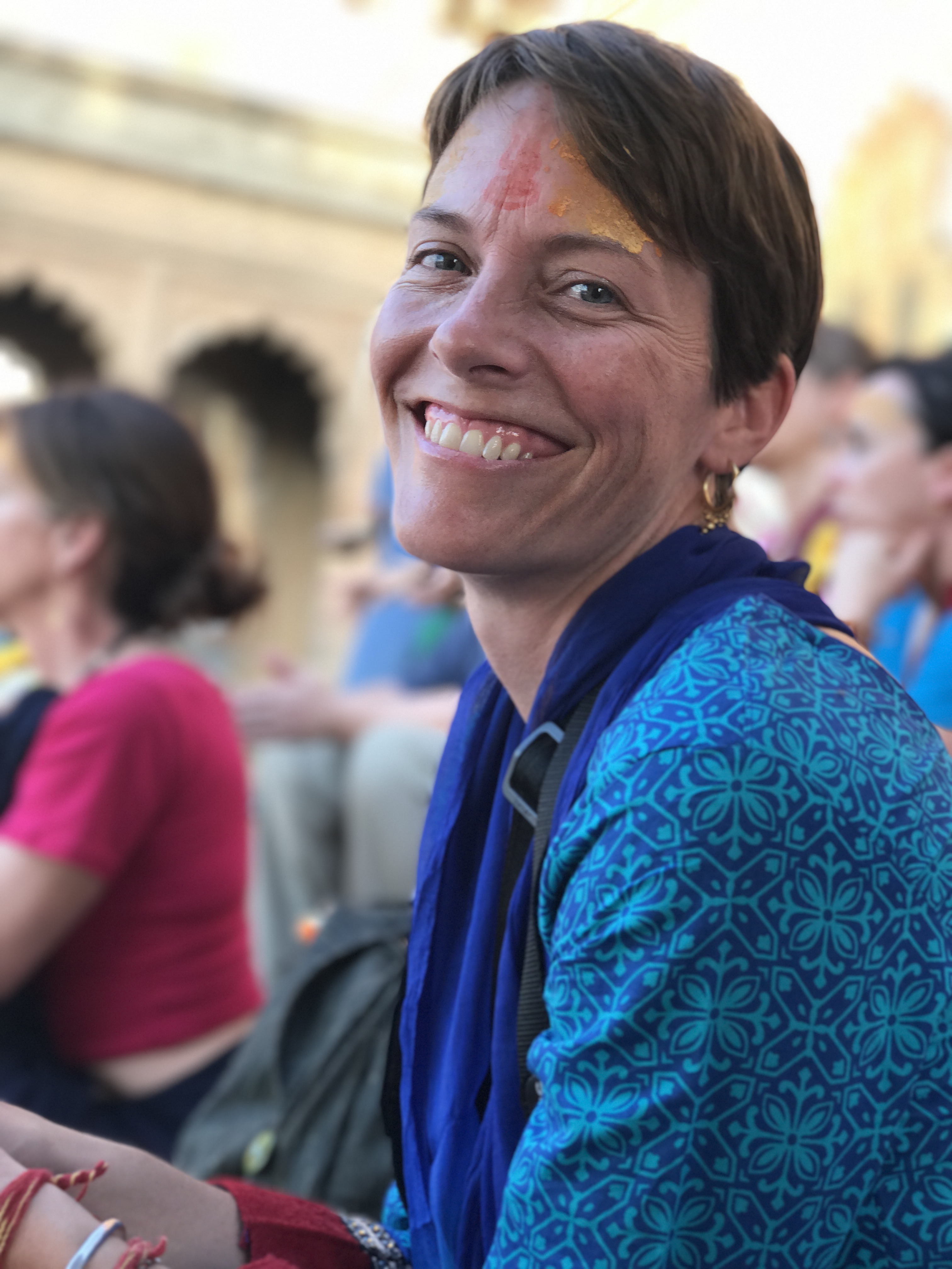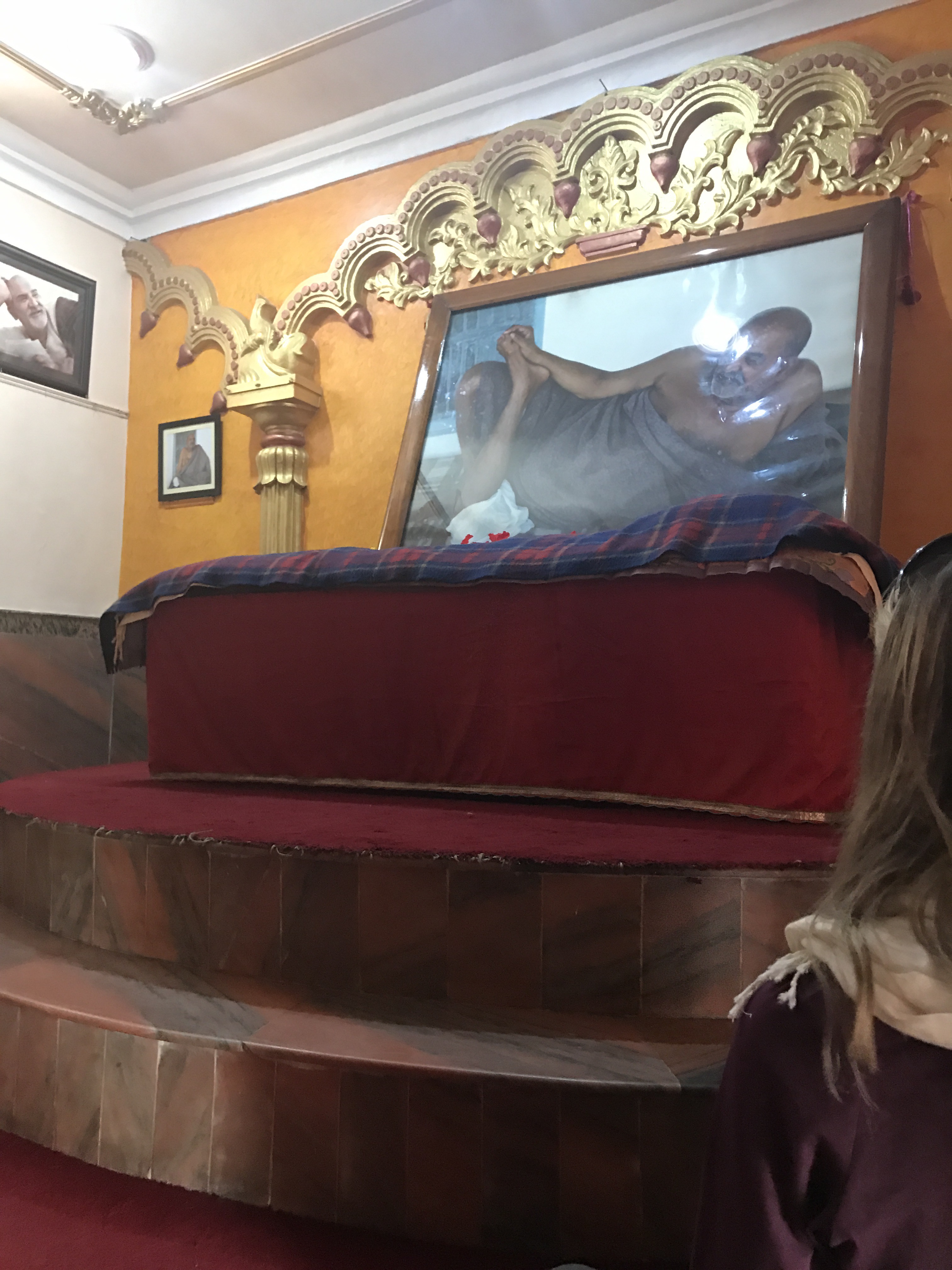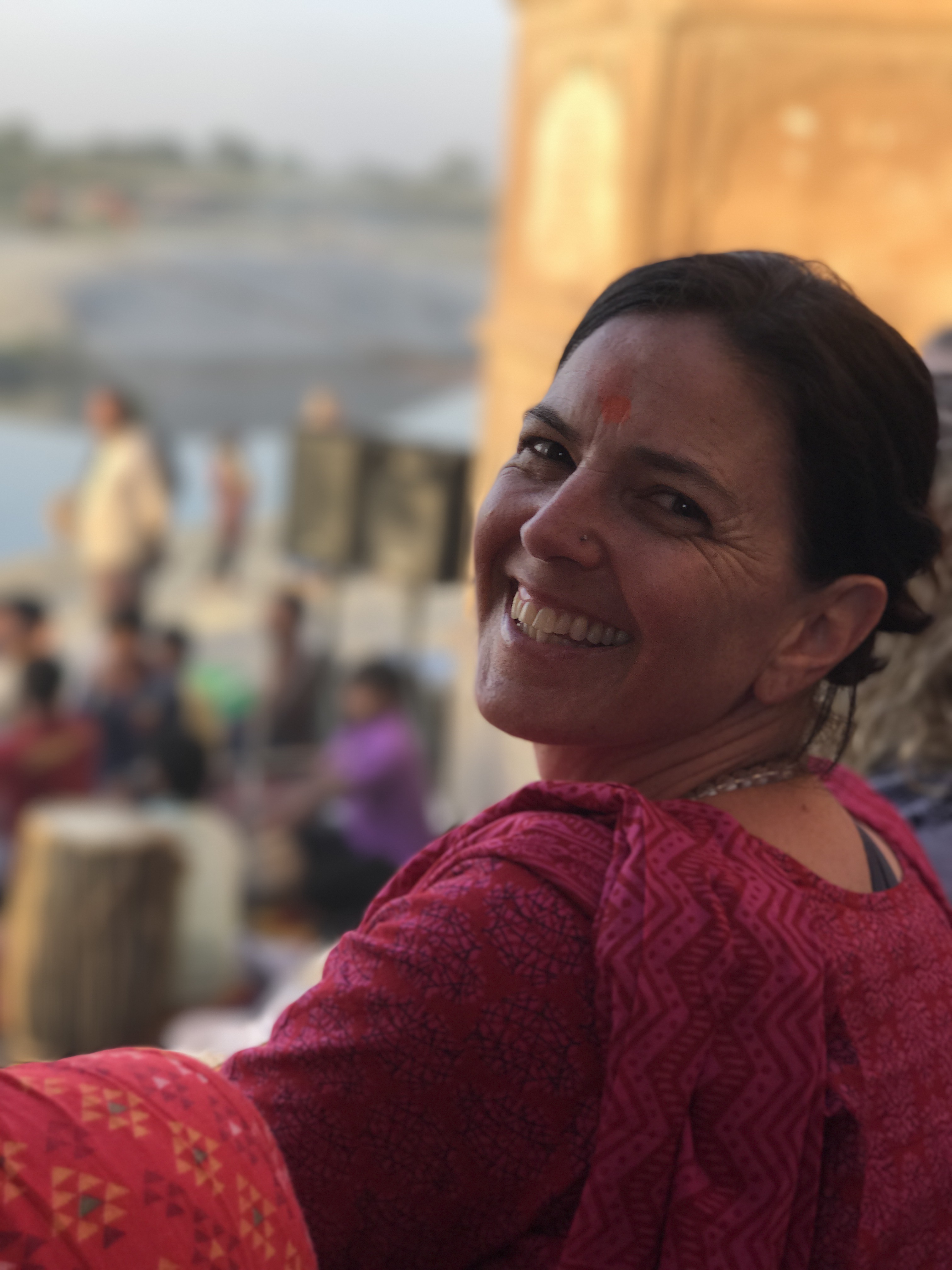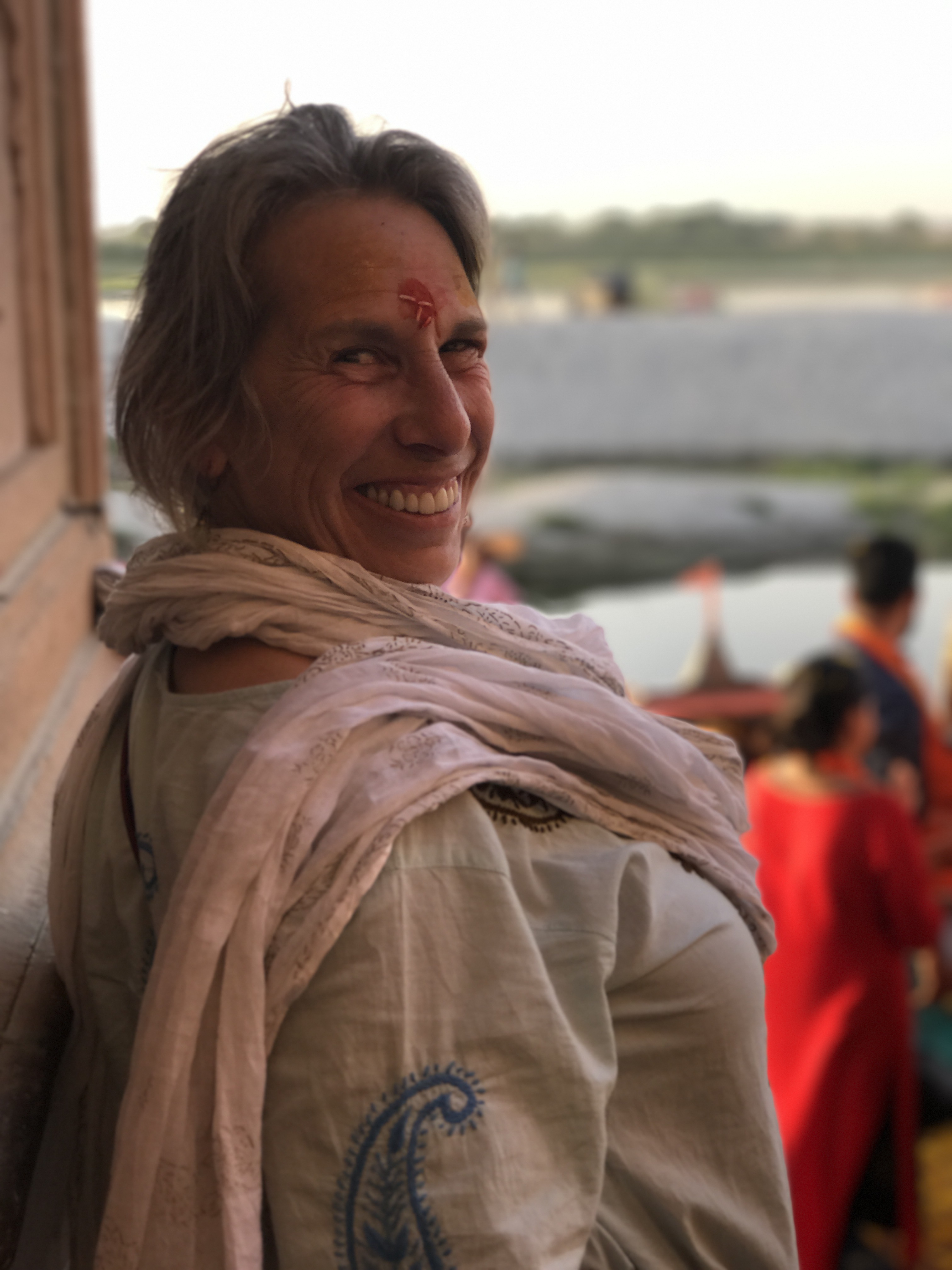 One morning we went to the Ashram of Neem Karoli Baba in Vrindavan. It opened my heart to tears of love and joy. I brought my friends Srutih, Carol, and Jana there with me in my heart as I walked in.  I fed the baby cows with everyone, and then sat and meditated in the room where Neem Karoli Baba stayed. I am new to meditation. There I was, calm and grounded. I saw visions of blue water everywhere like the Pacific Ocean was all around me. I didn’t want to leave that room. That morning something shifted. I was open and present with myself in a way I never had been before. I’m not a person that believes in gurus. I believe in myself.  In that place I could feel the overwhelming love and acceptance of a light being, and the love that oozes everywhere in that city.