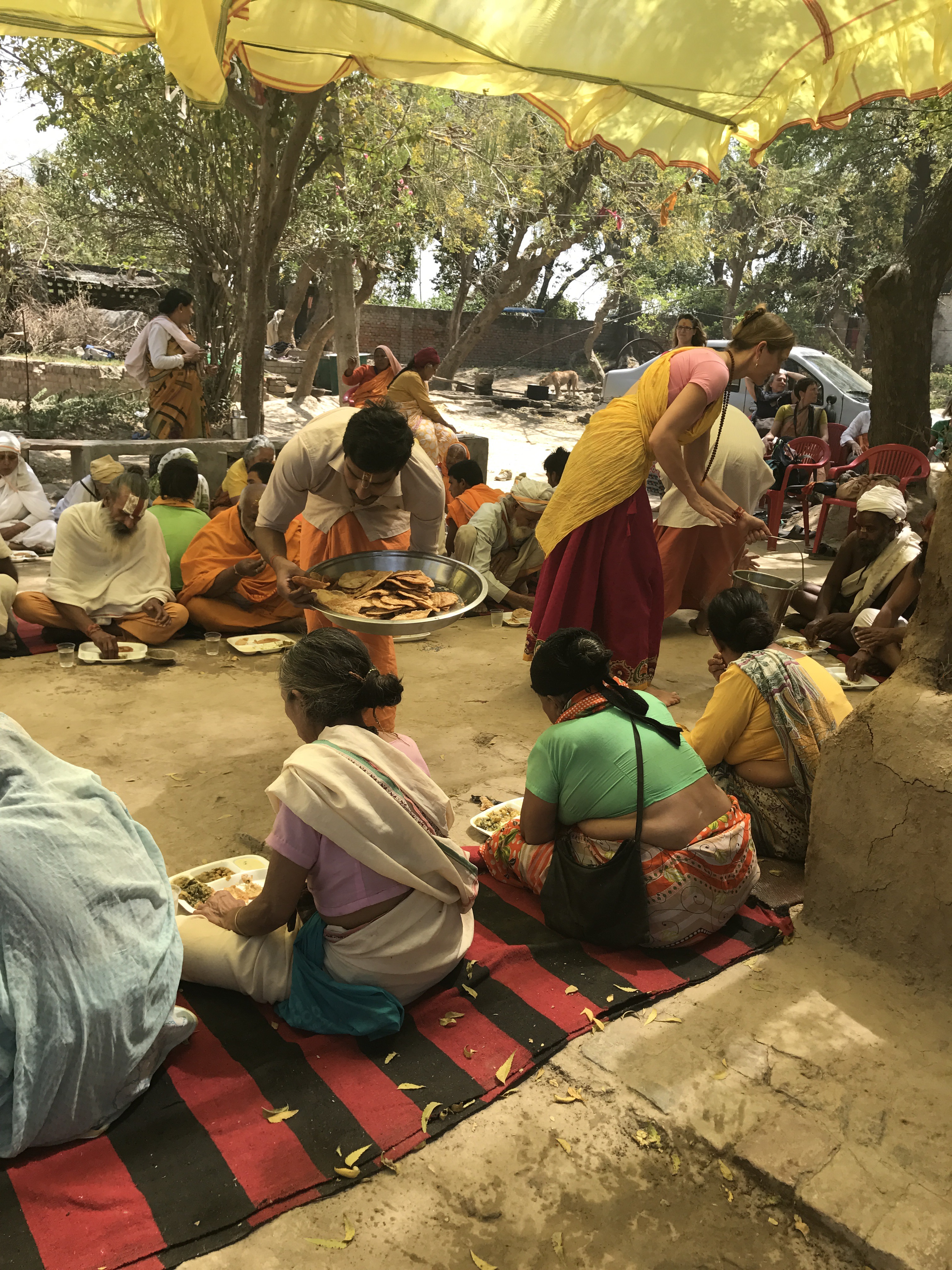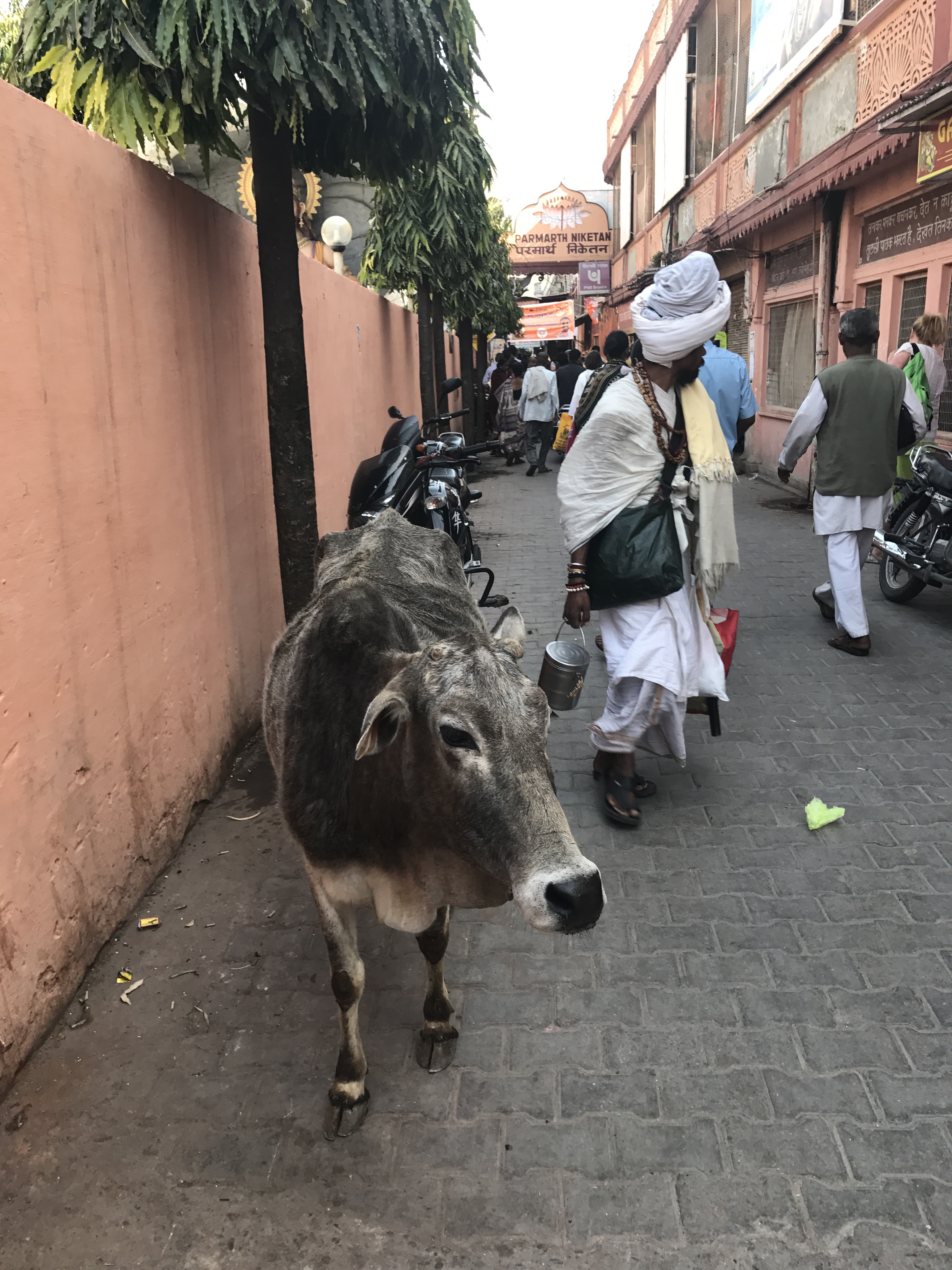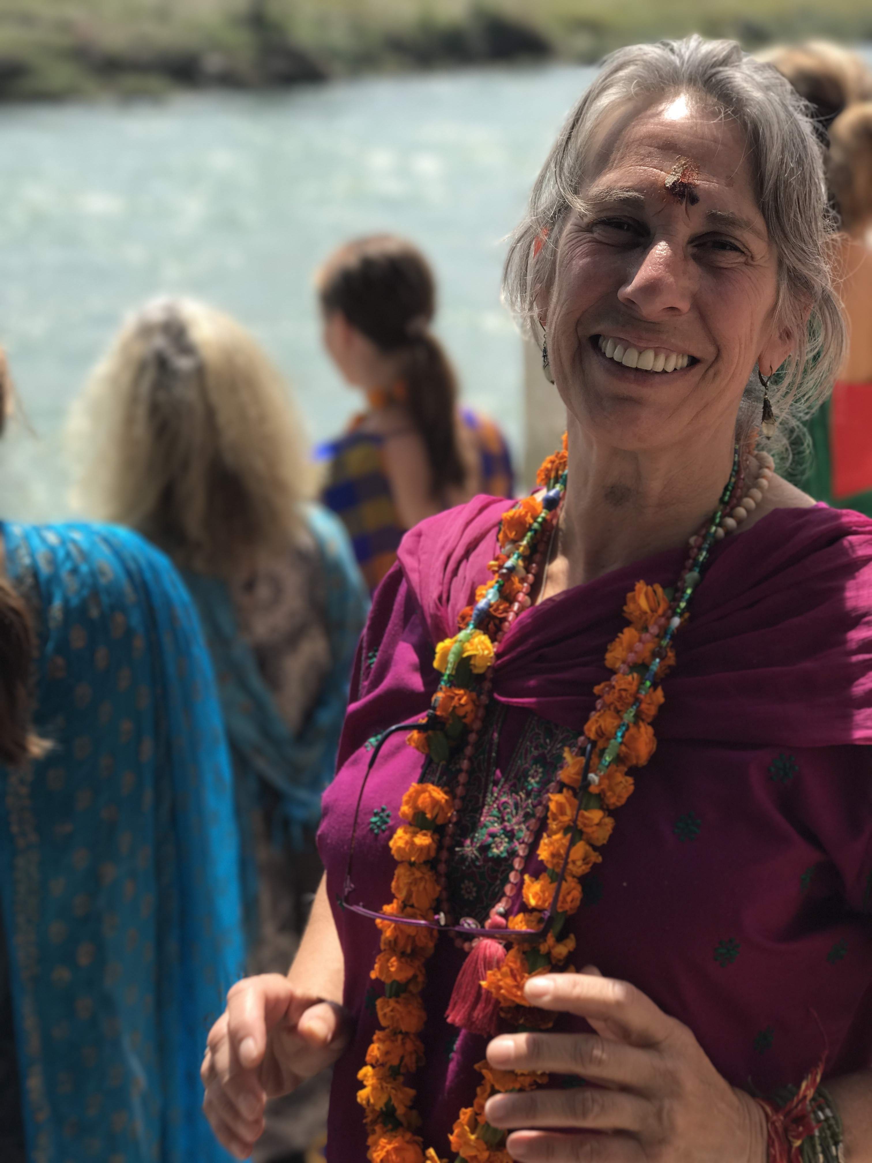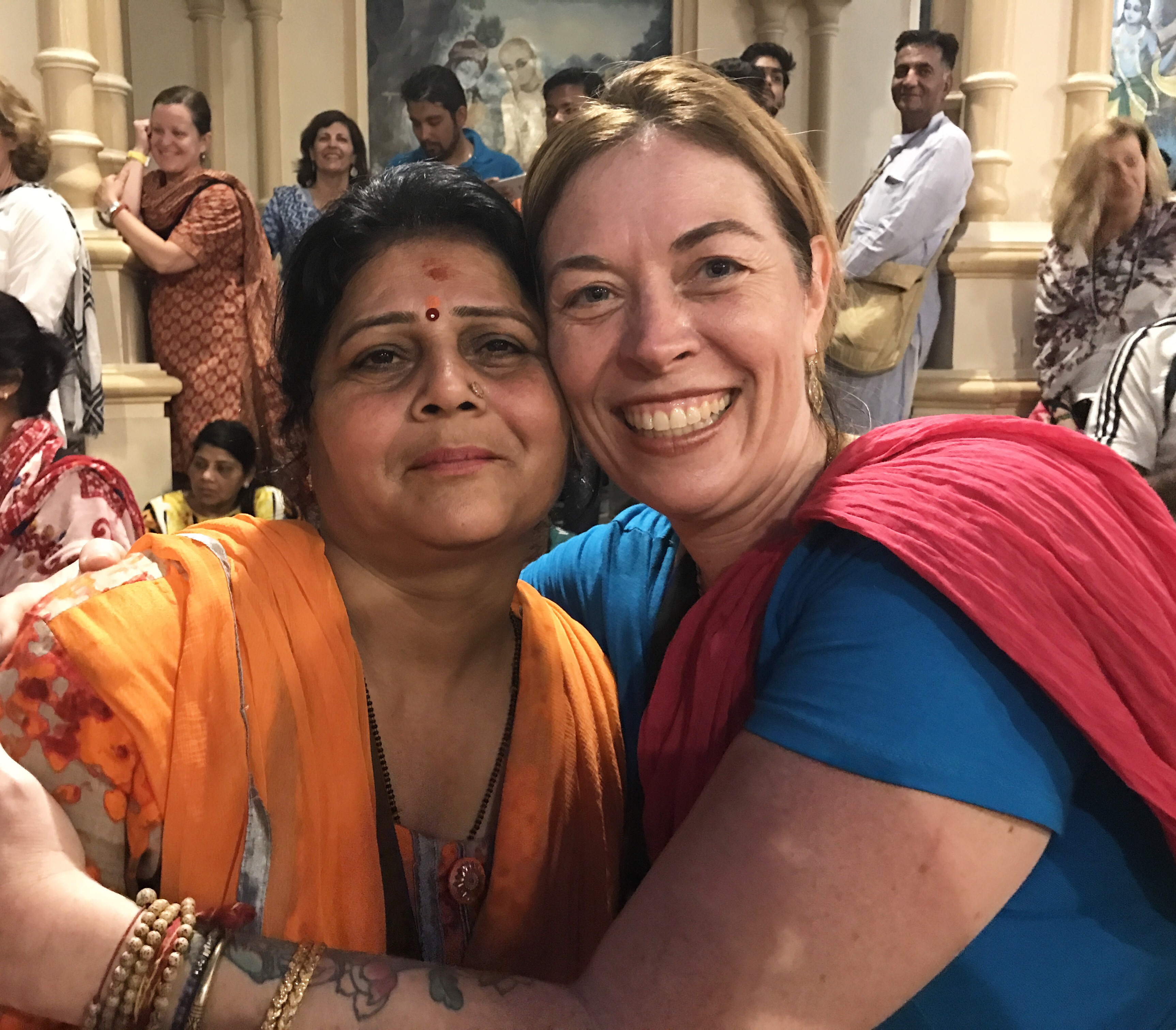 One morning we went to the Ashram of Neem Karoli Baba in Vrindavan. It opened my heart to tears of love and joy. I brought my friends Srutih, Carol, and Jana there with me in my heart as I walked in.  I fed the baby cows with everyone, and then sat and meditated in the room where Neem Karoli Baba stayed. I am new to meditation. There I was, calm and grounded. I saw visions of blue water everywhere like the Pacific Ocean was all around me. I didn’t want to leave that room. That morning something shifted. I was open and present with myself in a way I never had been before. I’m not a person that believes in gurus. I believe in myself.  In that place I could feel the overwhelming love and acceptance of a light being, and the love that oozes everywhere in that city.
